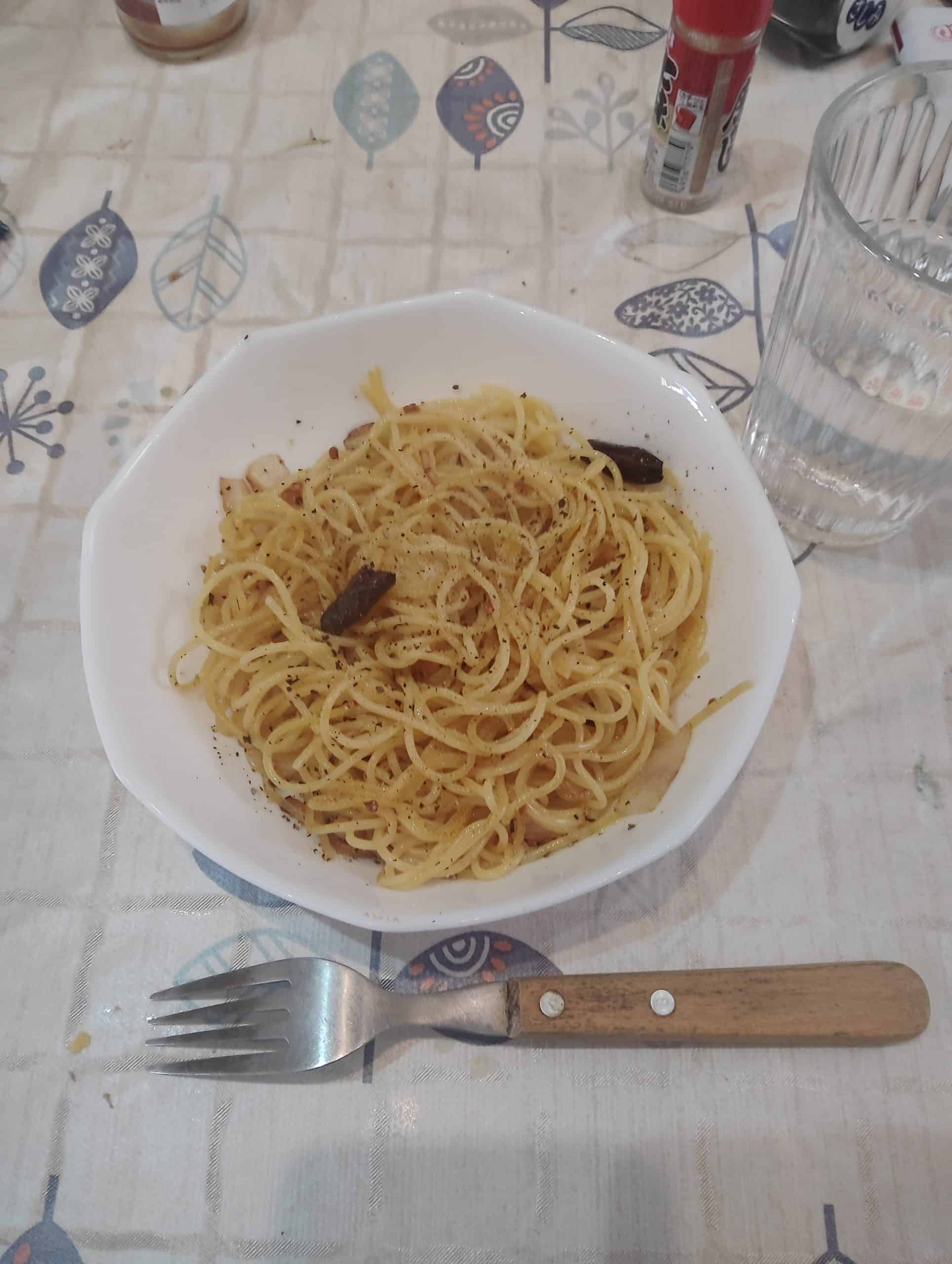 パスタがまだ半分ぐらい残っており、ところが チーズもベーコンもなくなっていたので